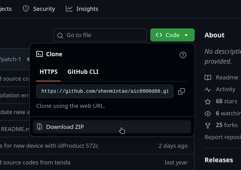 - Stiahnuť archív zip zo stránky https://github.com/shenmintao/aic8800d80 a dať pravým tlačítkom rozbaliť. Vznikne zložka aic8800d80-main, do nej treba vojsť. Kliknúť pravým tlačidlom a vybrať možnosť Otvoriť v Termináli, pokračovať tam.
